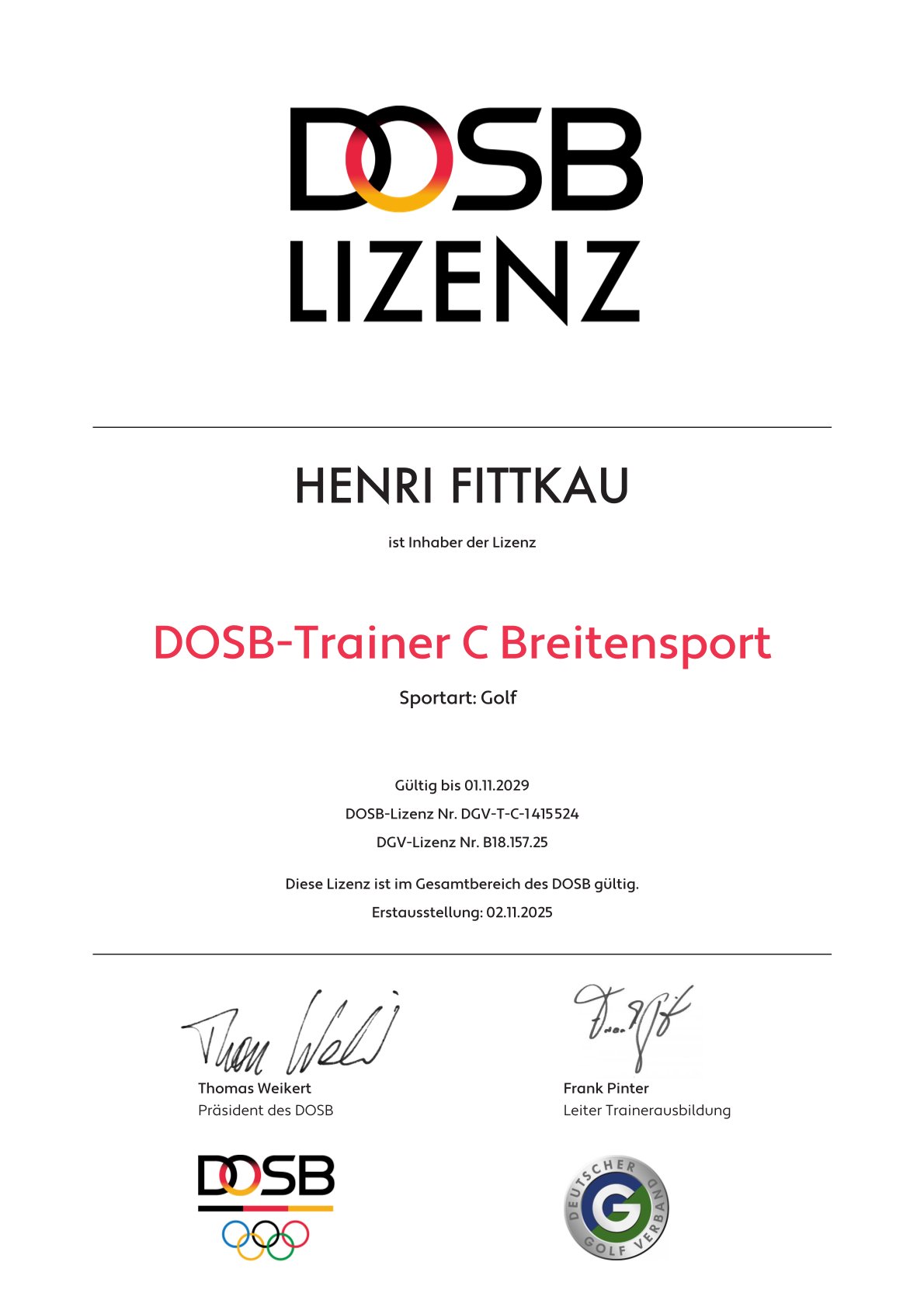 His commitment has paid off: Henri has successfully passed the final exam for the DOSB C Coach – Recreational Sport / Golf.